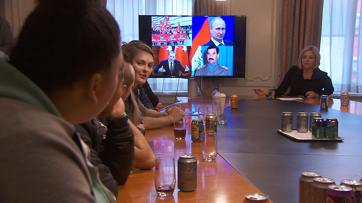 “Welkom op mijn ministerie, het voormalig Ministerie van Oorlog”, zegt minister Hennis hartelijk als de jongeren haar kantoor aan Plein 4 binnenkomen. De 15 leerlingen zijn net in het Defensie Operatie Centrum geweest, waar ze door generaal-majoor der mariniers Richard Oppelaar zijn opgewarmd met informatie over operaties en missiegebieden. Ze vraagt de jongeren wat vrijheid voor hen betekent. Om vervolgens, zonder hen de kans te geven hun aandacht te laten verslappen, stevig haar college te beginnen met: “Dit is geen ver-van-mijn-bed-show, de dreigingen kunnen ons ook raken. Denk aan de MH-17 en de aanslagen in Brussel en Parijs. Maar realiseer je ook dat die Iphone waar jullie zo’n beetje mee vergroeid zijn, alleen betaalbaar is omdat die via vrije handelsroutes naar Nederland komt.”