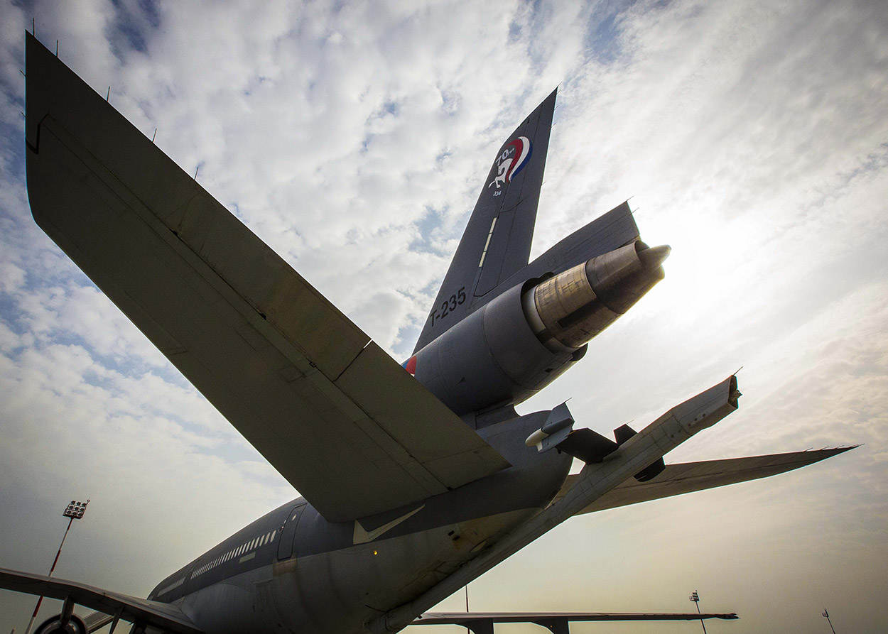 Tonnen brandstof: Onder de staartmotor hangt de boom, de ‘arm’ waarmee andere vliegtuigen worden bijgetankt. In de eerste 3,5 week van de missie zijn er zeker 16 missies gevlogen en heeft de bemanning van de KDC-10 bijna 640.000 liter brandstof overgepompt in de lucht.