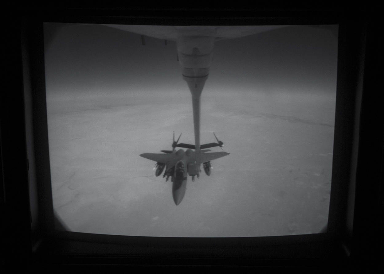 Volop bewapend: Het is duidelijk, dit is geen oefening. Kijkend op het schermpje van de boom operator is goed te zien dat een F-15 Strike Eagle volhangt met bommen en raketten. Daarom is het des te belangrijker dat het bijtanken secuur gebeurt. Een klein foutje kan grote gevolgen hebben. Zeker bij zwaarbewapende vliegtuigen.