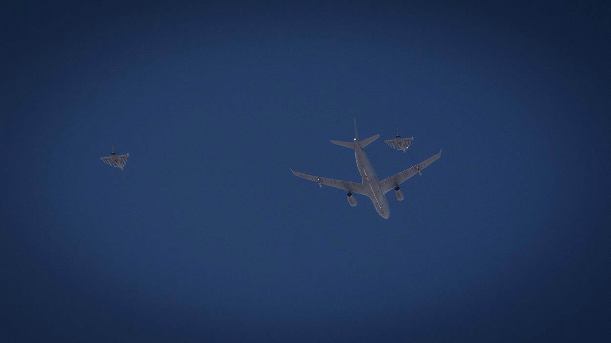 Even bijtanken: De Nederlandse KDC-10 is niet het enige tankertoestel boven het missiegebied. Vanuit de cockpit van de Nederlandse kist is te zien hoe een Brits tankvliegtuig enkele gevechtstoestellen bijtankt. Boven het strijdtoneel worden tot wel 40 ‘vliegende benzinestations’ ingezet, de meeste van de Amerikaanse luchtmacht. Maar bijvoorbeeld ook Duitsland, Frankrijk, Groot-Brittannië en Australië doen mee.
