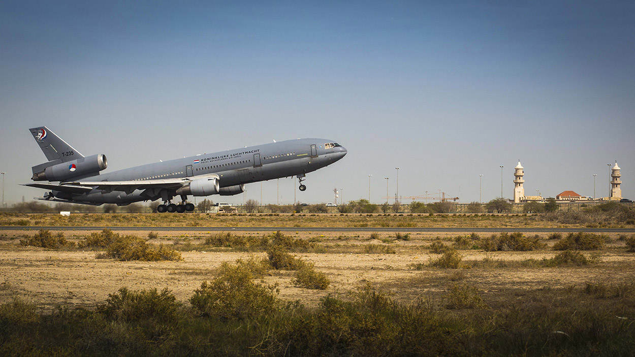 Luchtmachtbasis Al Mubarak, Koeweit. Met nog enkele minuten te gaan tot de take-off, staat iedereen op scherp. Straks vliegt de Nederlandse KDC-10 boven Irak en Oost-Syrië, gebieden waar terreurorganisatie ISIS het op veel plaatsen voor het zeggen heeft. De missie: vliegtuigen van de coalitie in de lucht bijtanken, zodat zij langer in de lucht kunnen blijven om posities van de terroristen te bestoken.