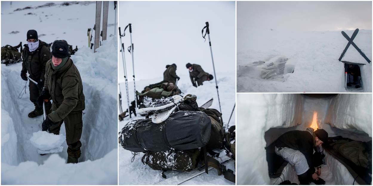 Regel 1 bij het overleven onder extreme omstandigheden: ga uit de elementen. In het geval van de wintertraining betekent dit dat de mariniers er soms juist dieper in gaan. Een onderkomen in de sneeuw biedt beschutting tegen de ergste kou. Maar het vergt eerst nog wel wat inspanning om een sneeuwverblijf te bouwen.