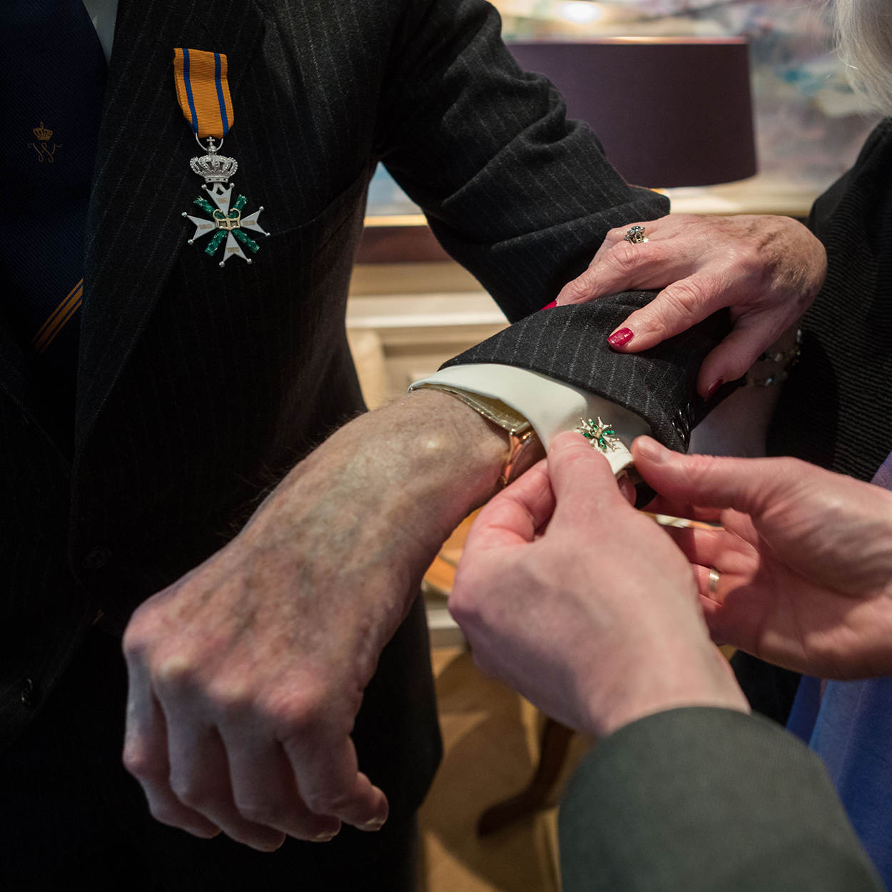 Major Ken Mayhew draagt handgemaakte manchetknopen van de Militaire Willems-Orde, een cadeau van Koning Willem-Alexander.