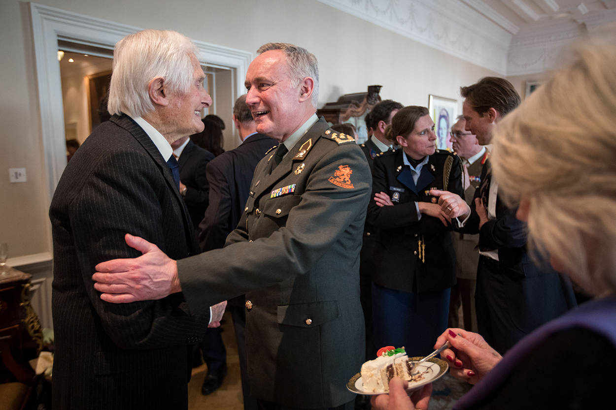 Even 100 jaar later staat Ridder Militaire Willems-Orde Ken Mayhew 2 uur lang felicitaties in ontvangst te nemen in de ambtswoning van de Nederlandse ambassadeur in Londen, Simon Smits. “Ik ben op zoek naar zijn geheim: hoe word je 100 zoals Ken”, zegt een van de gasten, Commandant der Strijdkrachten generaal Tom Middendorp.