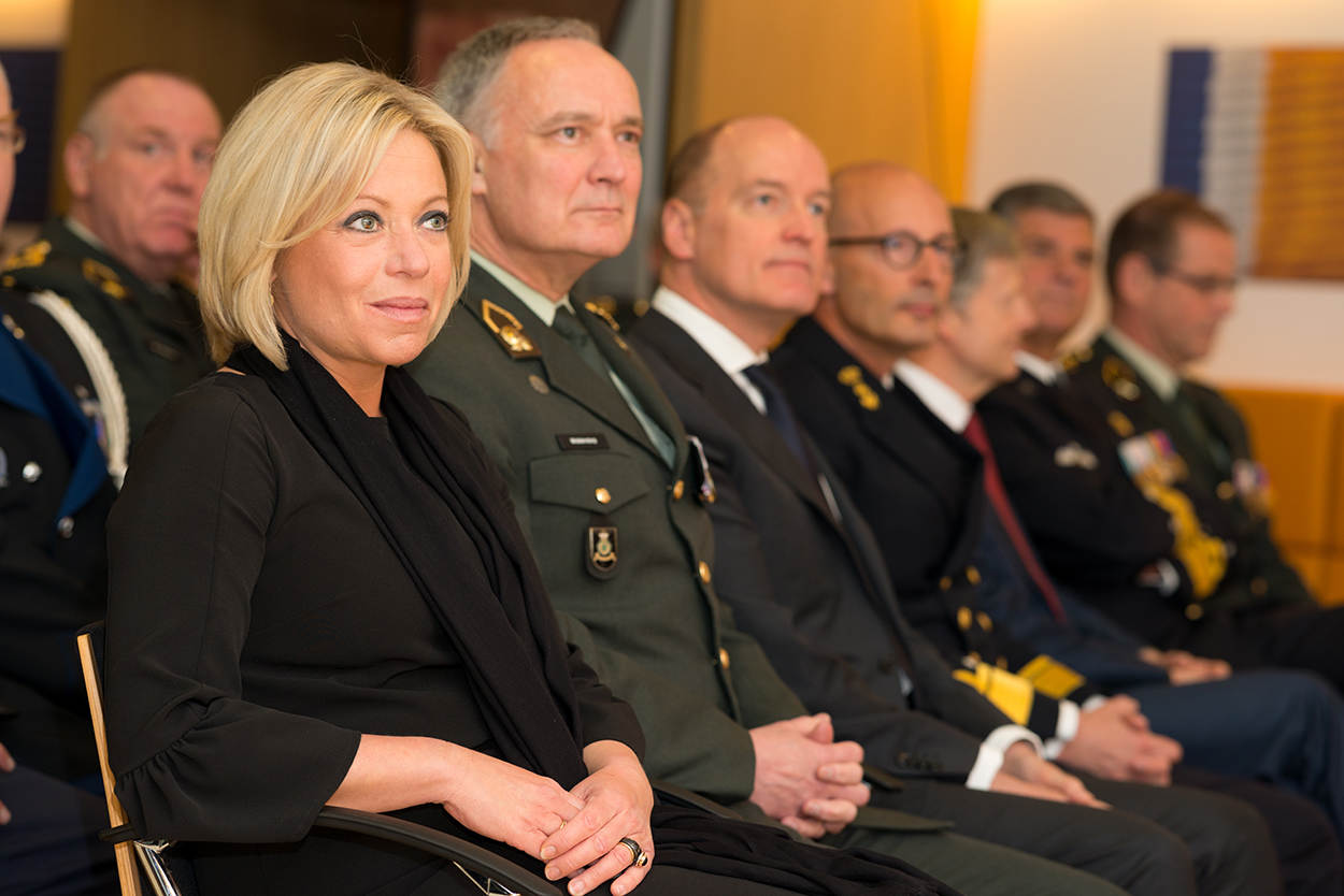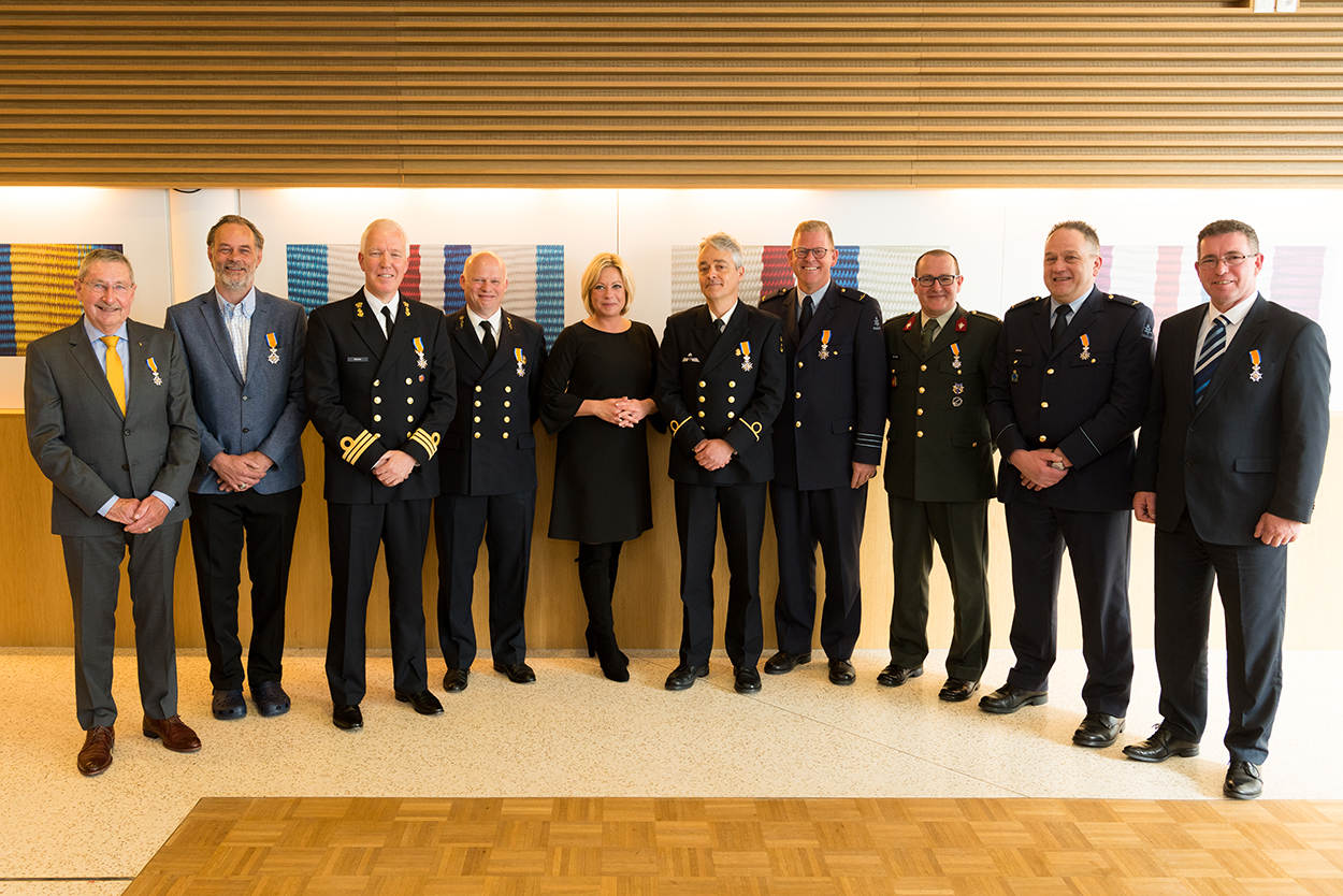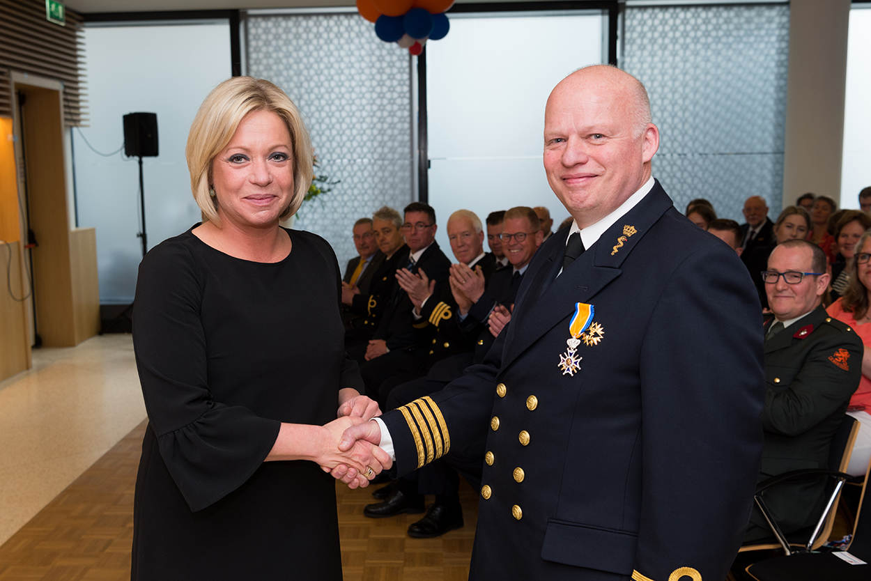 Op deze manier begon de uitreiking van koninklijke onderscheidingen vorige week op het ministerie van Defensie. Kapitein-ter-zee-arts Remco Blom, in het dagelijks leven commandant van het Eerstelijns Gezondheidszorg Bedrijf was de eerste die in het zonnetje werd gezet. Minister Jeanine Hennis-Plasschaert stond bij ieder van de te decoreren Defensiemedewerkers stil en speldde na haar introductie de betreffende onderscheiding op. Dat deed ze 9 keer. In totaal kregen echter 21 Defensiemedewerkers een koninklijke onderscheiding.
