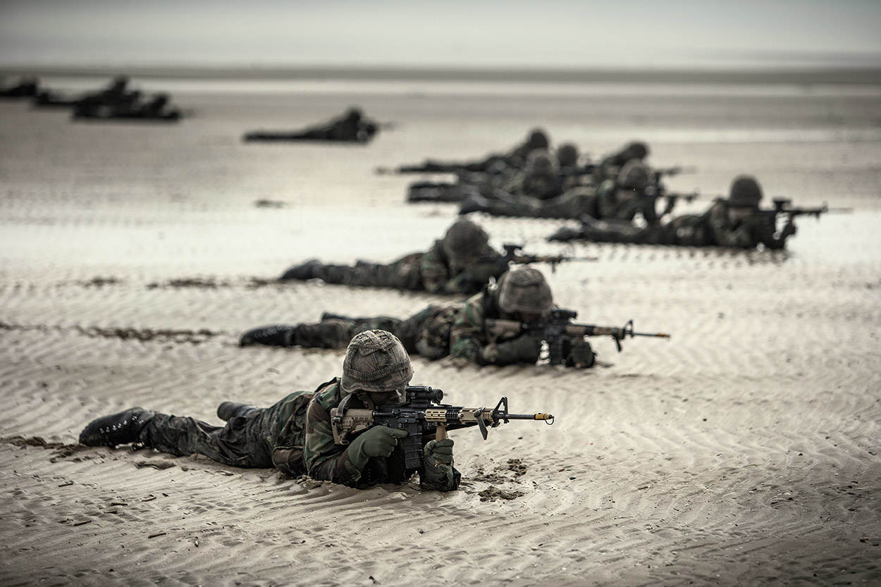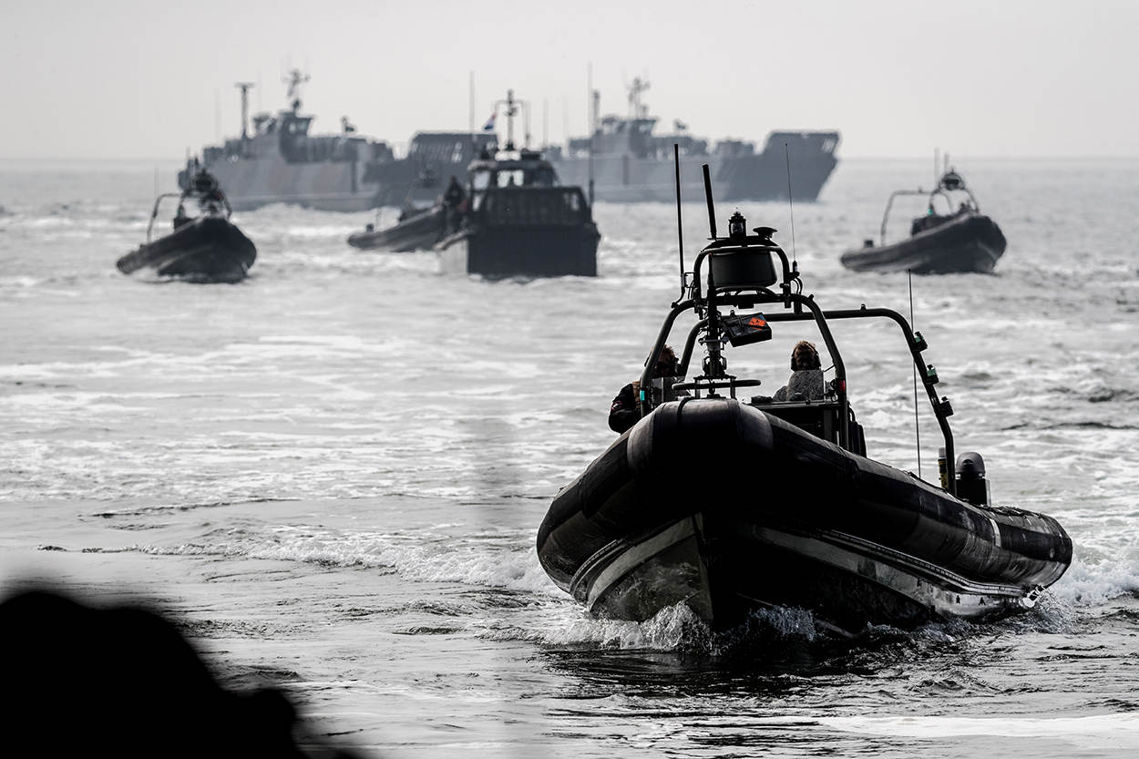 Rustig ligt Zr. Ms. Rotterdam in een strakke Waddenzee als uit de buik van het grootste schip van de marine 2 LCVP’s tevoorschijn komen. 4 FRISC-motorboten zorgen voor vuursteun als de kleppen van de landingsvaartuigen langzaam opengaan. Ruim 50 mariniers in opleiding springen eruit, banjeren door het water en vallen plat op het strand. Wapen vooruit. Blik gefocust op de duinen.