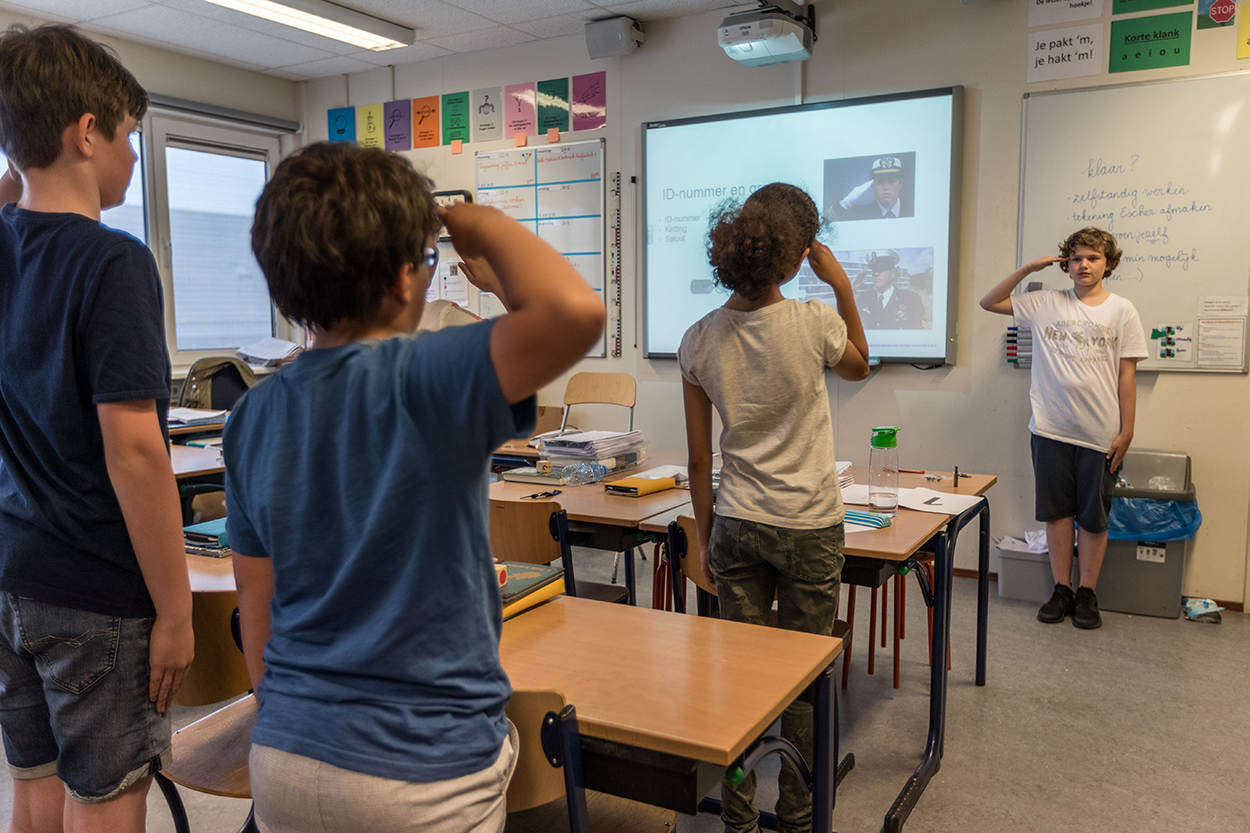 Na een nerveus begin krijgt Luca de smaak te pakken. De belangrijkste gegevens lepelt hij moeiteloos op en de kinderen luisteren aandachtig . Ze nemen de videoclips over onder meer de rugzak en de militaire groet gulzig in zich op. Luca heeft ook wat materiaal meegenomen om door de klas te laten gaan, zoals de wings van een vlieger en een naamplaatje dat hij in het Nationaal Militair Museum heeft laten maken. “Dat is cool”, zegt een van de kinderen.