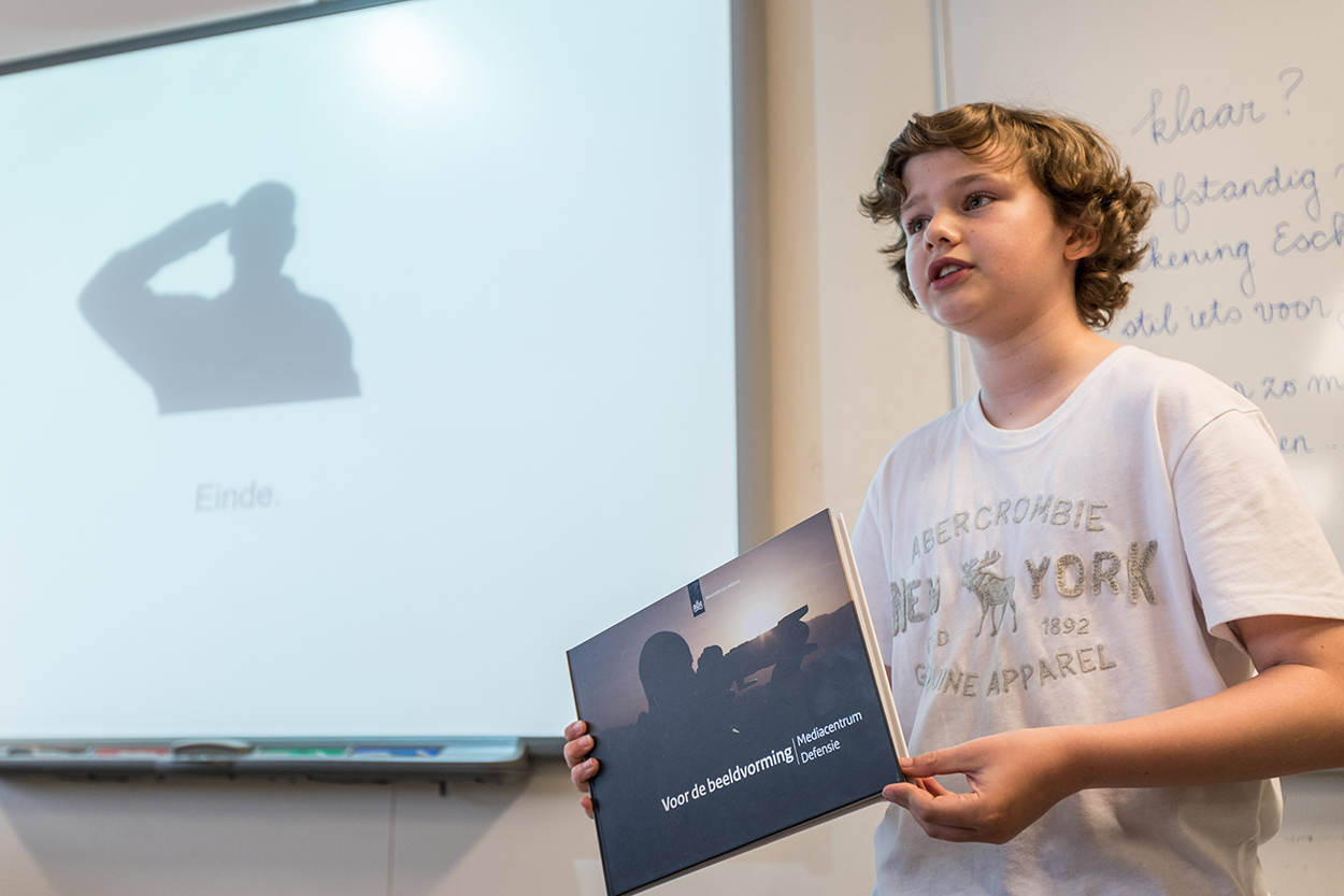 De aanwezigheid van een een fotograaf in camouflagepak zal daaraan best wat bijdragen. Hoe kwam hij eigenlijk op het idee om Defensie als onderwerp te nemen? “Ik had op defensie.nl de zoekopdracht 'spreekbeurt' ingetikt en toen kwam dit hele pakket tevoorschijn. Het is heel compleet, met veel informatie en filmpjes. Dat vinden ze in mijn klas altijd wel leuk.”