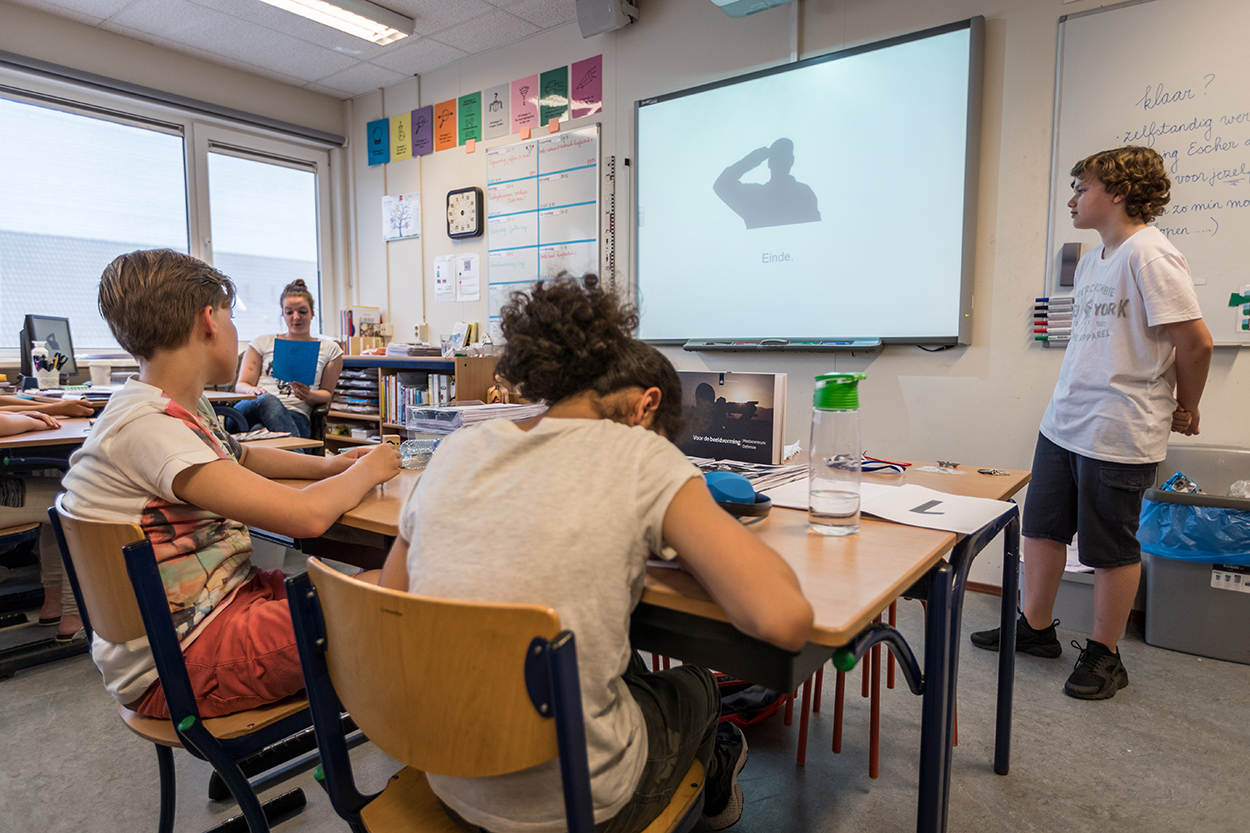 Luca betrekt zijn klasgenoten ook nadrukkelijk bij zijn spreekbeurt. “Nu ga ik jullie leren salueren meldt hij. Als een volleerd instructeur zet hij de klas in de houding en iedereen brengt enthousiast de groet zoals die staat geprojecteerd op het schoolbord. Een korte quiz vormt het besluit van de presentatie. De reacties zijn zeer positief. “Ik heb er veel van geleerd”, reageert Mitchell. “Je had iets rustiger kunnen beginnen en misschien iets harder moeten praten”, oordeelt Eva. “Het zat goed in elkaar en duurde ook niet te lang meldt een ander.”