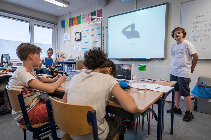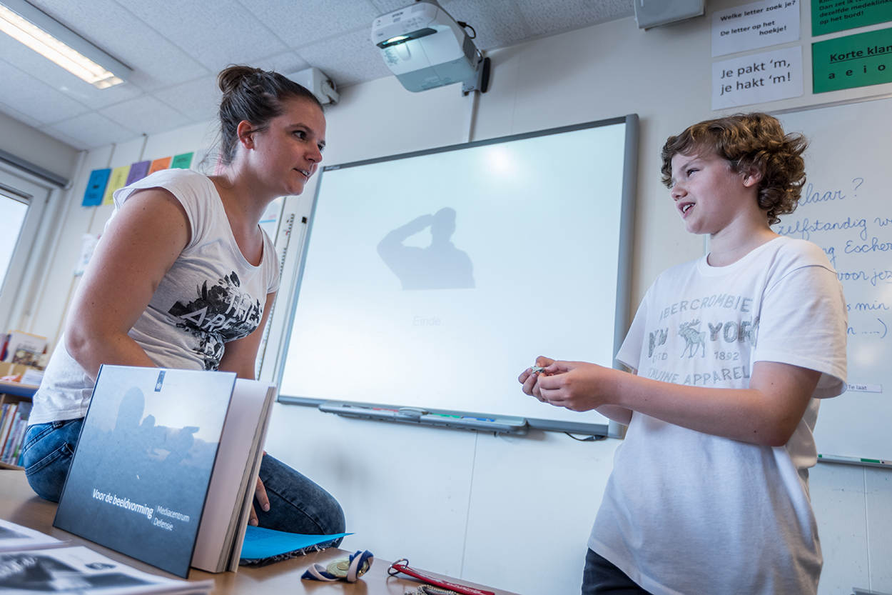 Luca beperkt zich ook niet alleen tot de informatie uit het pakket. “De hoogste onderscheiding is de Militaire Willems-Orde”, vertelt Luca zijn klas. “Die heeft Marco Kroon gekregen en hem heb ik een keer ontmoet”, voegt hij vol trots toe.