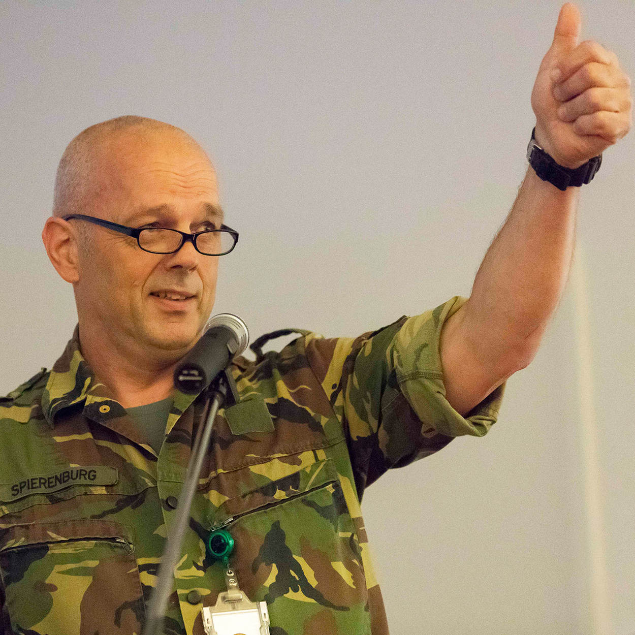 “Blij dat ik er ben. Dit is een leuke en belangrijke dag voor onderofficieren. ‘Wie zijn we en waar gaan we heen’ is een vaak terugkerende vraag. Ik hoop dat de hogere legerleiding direct met ons wil praten. Ik zou dat graag doen. Er zitten veel lagen tussen de werkvloer en de top. Ik heb het idee dat we van elkaar niet weten wat er speelt. Er ís geld. Maar waar dan? Ik ben niet van het terugkijken, dus juist vooruit. Maar denkwijzen verschillen.”
