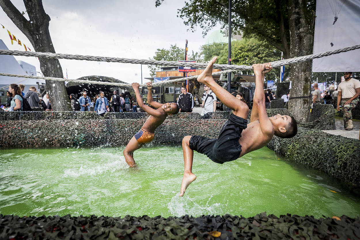 In het Mariniersdorp op steenworp afstand van de Euromast, dompelden kinderen zich wat graag onder in de wereld van Defensie. Soms zelf letterlijk...
