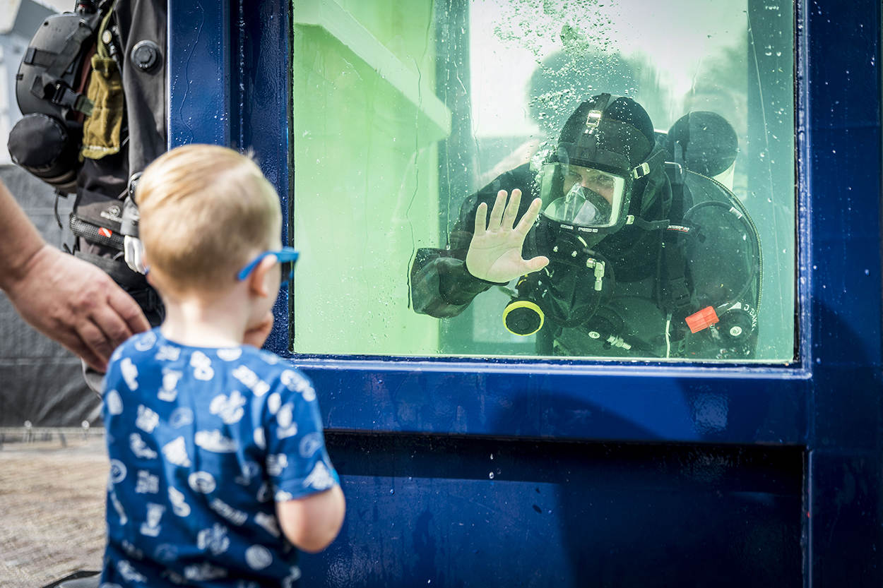 Een jongetje is gefascineerd door een defensieduiker, die in een watertank diverse demonstraties laat zien.