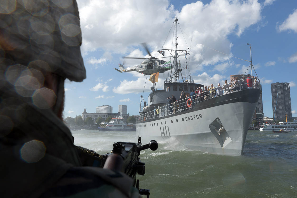 Zelden zie je ze zo laag; de NH90 maritieme helikopter van Defensie. Op de Wereldhavendagen vliegen ze af en aan. De vliegers ondersteunen mariniers, die een bevrijdingsactie van een gekaapt schip demonstreren. Ook laten ze zien hoe ze drugssmokkelaars onderscheppen in het Caraïbisch gebied.