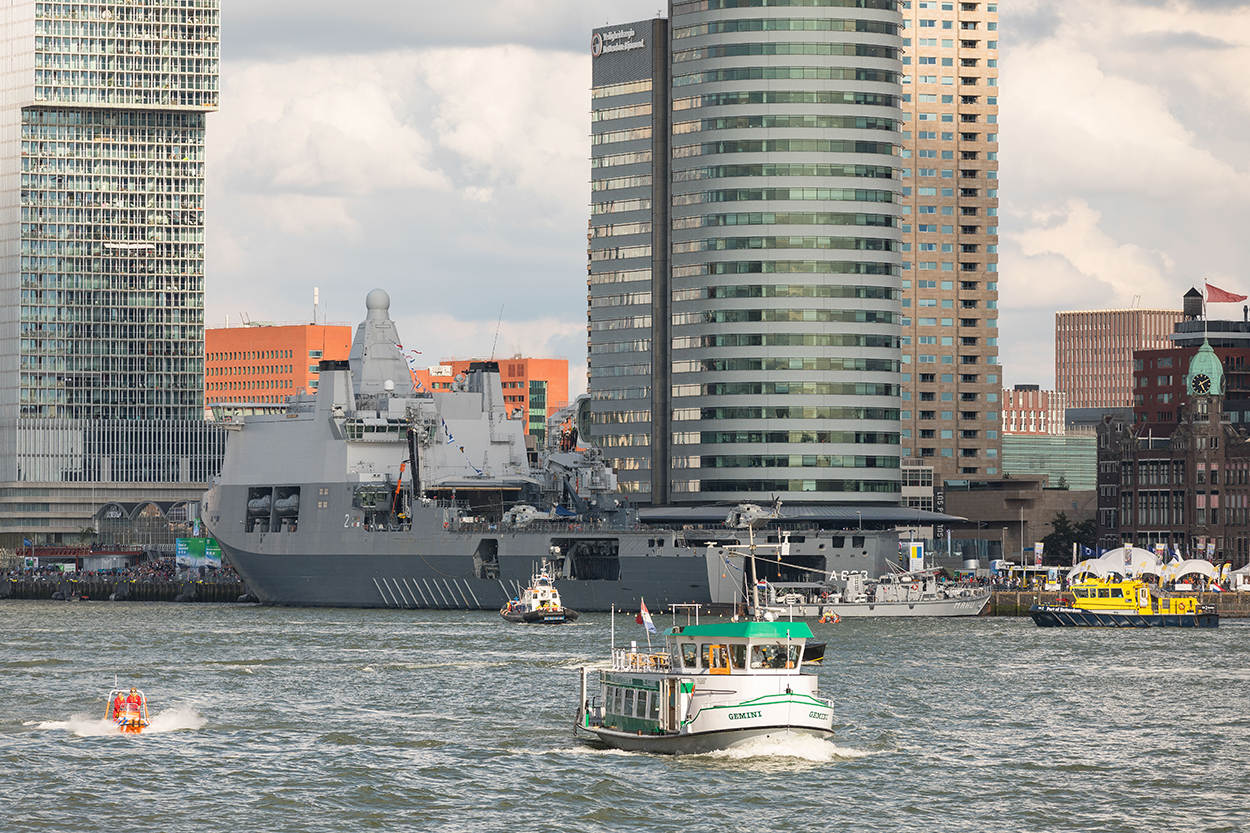 Langs de Rotterdamse Parkkade en Wilhelminakade ligt de Koninklijke Marine met een groot deel van de vloot. De ruim 50 jaar oude mijnenveger ‘AMS ms Bernisse’ lijkt piepklein bij het reusachtige, rode containerschip Big Roll Baffin.