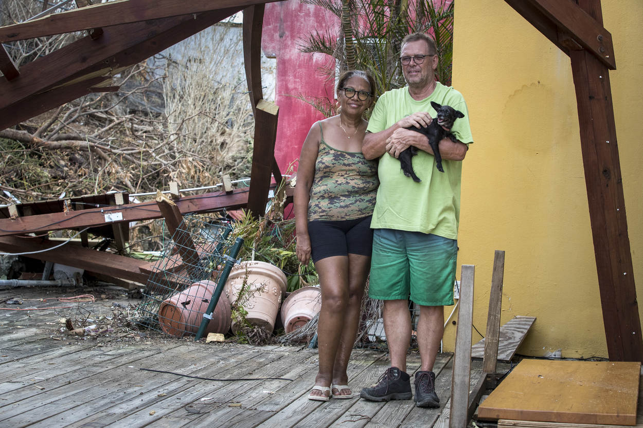 Het is de vraag die Binkie hardop stelt. Met zijn vrouw Ini woont hij al 30 jaar op het eiland. Hij stapt tussen de kapotgeslagen bloempotten, over de naar beneden gekomen pergola, richting zijn huis. Althans, wat daar van over is. Het dak is voor een deel verdwenen. Op de vloer staat een laag water en meubels zijn opgestapeld in een hoek gedrukt. “De enige droge plek”, zegt Binkie.