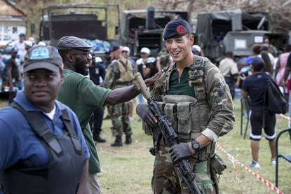 Ook de Nederlandse militairen van de genie merken de schaarste aan bouwmaterialen. Over een kleine 2 weken komt het Joint Support Ship Zr. Ms. Karel Doorman aan bij het eiland, volgeladen met onder andere bouwspullen. “Tot die tijd is het improviseren”, zegt korporaal Harm, genist bij 11 Luchtmobiele Brigade. Op het dak van het ziekenhuis werkt hij samen met genisten van het Korps Mariniers aan een lek.