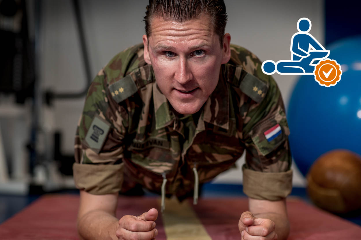 “Houd je rug recht, voeten op heupbreedte en trek je met gestrekte armen langzaam omhoog.” De 29-jarige kapitein fysiotherapeut Rahmon Zondervan legt een van zijn patiënten geduldig uit hoe ze een rug verstevigende oefening moet doen.