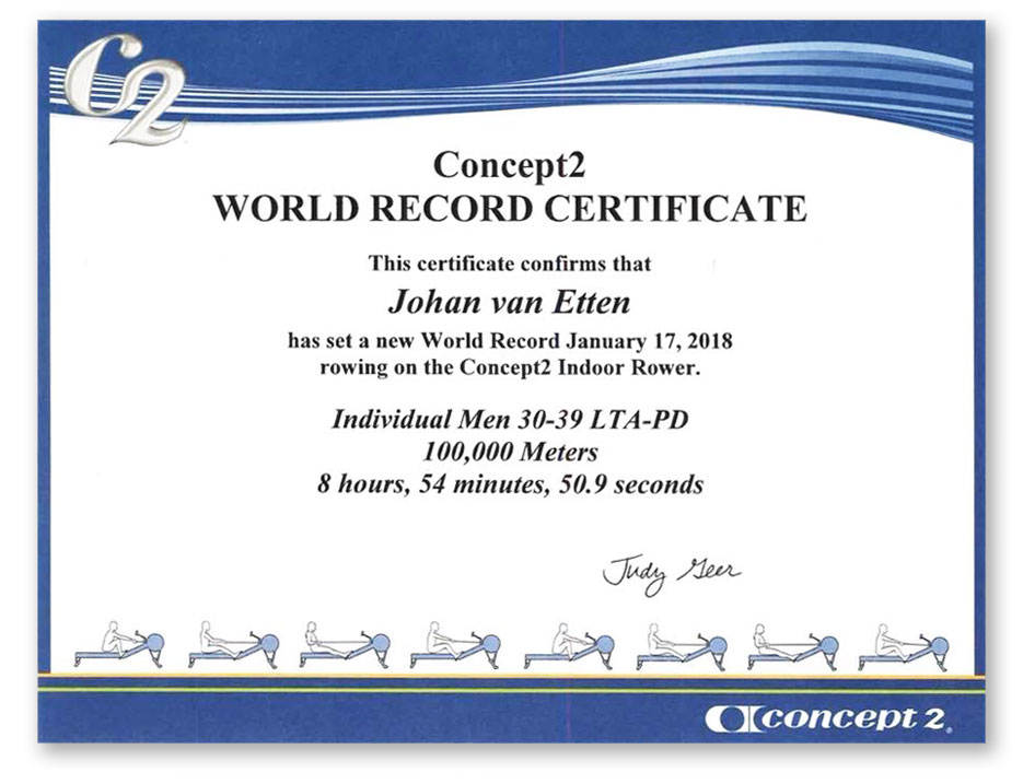 Van Etten roeide in 8 uur, 54 minuten en 50,9 seconden liefst 100 kilometer weg op een roeitrainer. Ruim 10 minuten sneller dan de tot dan geldende beste tijd. “Mijn streven was om er rond de 8 uur over te roeien, maar dat was wat al te optimistisch.”