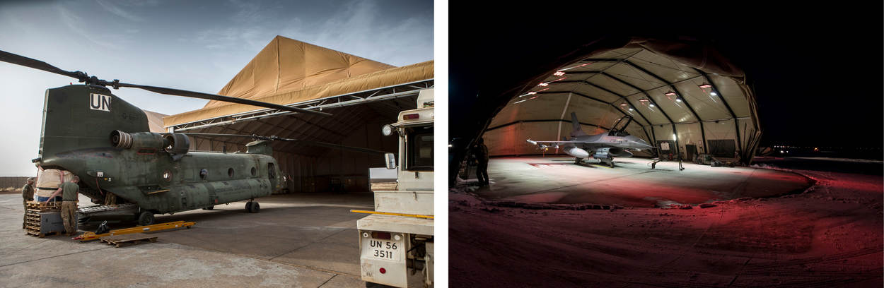 In Jordanië staan er F-16’s onder, in Mali helikopters en in Afghanistan doen ze dienst als eetzaal. En ook op Nederlandse bases staan tenten, gebouwd door de mannen van DUO. Bijvoorbeeld voor extra opslagcapaciteit.