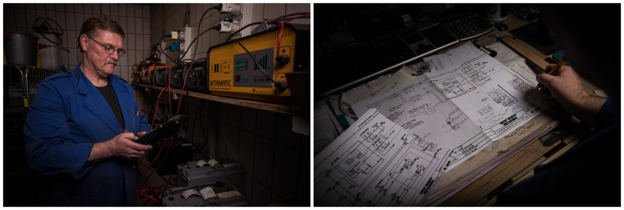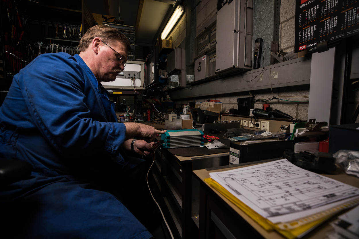 “Technisch kan ik me hier helemaal uitleven”, glundert Marcel Kater terwijl hij over de werkvloer loopt. “We hebben hier alles: een plaatwerkerij, lasser, spuiterij, timmermanswerkplaats en zelfs een zeilmakerij. Die combinatie zie je zelden.” Hij stopt bij een stalen werktafel met bureaustoel: “Ik ontwerp ook dingen op maat. Dan zit ik hier de elektrische schema’s in elkaar te puzzelen. Soms lig ik er wakker van. Maar als ik eenmaal de oplossing heb gevonden, is dat zo gaaf!”