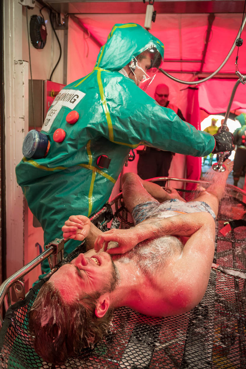Dan komt de stroom verschillende uniformen op gang. Brandweer, GGD, ME, marechaussee, RIVM en de CBRN Respons Eenheid van Defensie. Het doel: samenwerken. Dat is best lastig met zoveel spelers. Iedereen wil hetzelfde, maar doet dat net op een andere manier. “Welk gebied rond de aanslag is veilig? Wie geeft het gebouw vrij? Daar moeten tussen de civiele partners en Defensie duidelijke afspraken over bestaan. Dat trainen we vandaag”, aldus Robert Raben van de Brandweer Flevoland.
