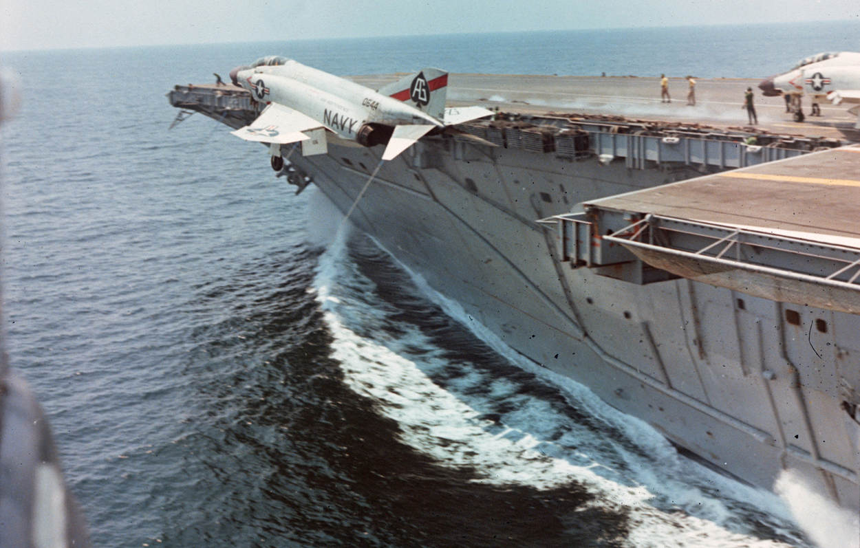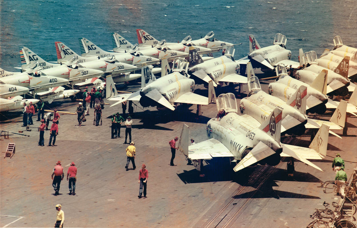 Straaljagers op het dek van de Independence. Vooraan een paar Phantoms van het squadron van Wheat (Foto: McDonnell Douglas).