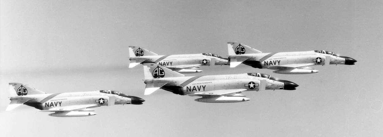 Een formatie van 4 Phantoms van VF-41 Black Aces. Ieder toestel heeft een vlieger en een wapenofficier (archief Defensiekrant).