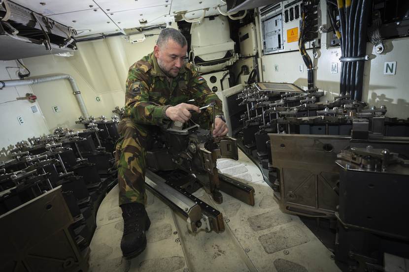 Melvyn sleutelt al vanaf 2006 aan de Pantserhouwitsers. Bij 431 Herstelpeloton neemt hij het bovenstel en de elektronica voor zijn rekening, zijn collega sergeant-1 Werner de Vries doet het onderstel. Melvyn sleutelt 70% van de tijd in het veld, de resterende 30 werkt hij in de behaaglijk verwarmde loods. “Onze locatie kan niet beter: een ruime loods, veel ruimte, zelfs de schietbuis kan in de loods omhoog. Nee, zo luxe staan we zelden! Deze oefening zijn vooral de autoloaders, het geautomatiseerde laadsysteem, problematisch. Heeft alles te maken met het weer: sneeuw, dooi, binnen vochtig... daar kan elektronica slecht tegen. We krijgen vrij veel storingsmeldingen, maar die zijn over het algemeen ook weer vrij vlot op te lossen. Nieuw printkaartje doet vaak wonderen. In Afghanistan functioneerde de pantserhouwitser als de beste: stond 'ie continu aan en door een specifiek onderhoudsprogramma voorkwamen we veel storingen. Hier is het weer een heel ander verhaal. Bij het onderstel waren het de schokbrekers die voor werk zorgden. Hebben we er 12 van moeten vervangen, zelfs extra opgevoerd vanuit Nederland. We denken dat het te maken heeft met de speciale sneeuwkruizen onder de rupsen, maar dat moeten we nog een keer goed testen. Voor mij blijft de pantserhouwitser een uitdagend apparaat. Zelfs nu nog, na zoveel jaar eraan sleutelen, weet het apparaat me af en toe nog te verrassen. Dat ik denk: Goh, zit dat zo?!”
