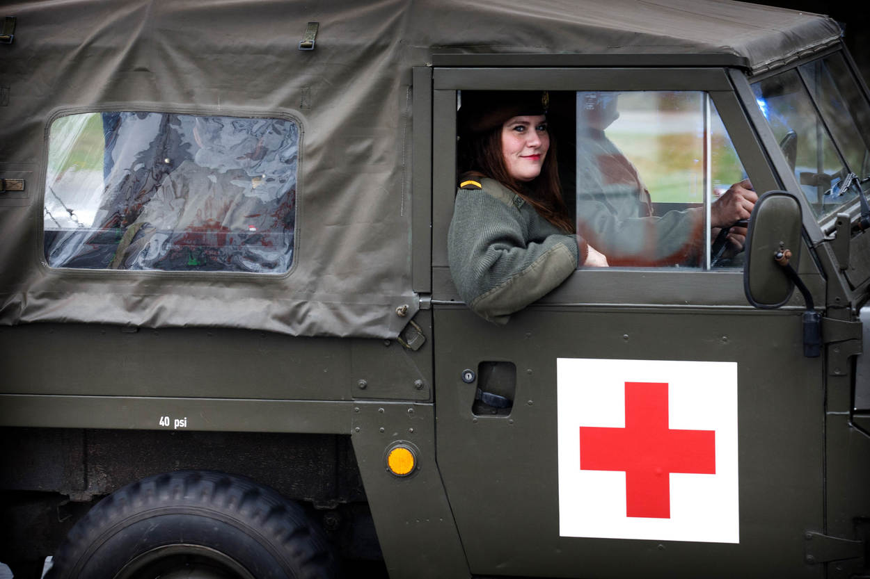 Een dame zit trots kijkend in een historisch militair voertuig tijdens het 'Ouwe Stompen Bal'. Dit is een jaarlijkse rondrit van Soest naar Amersfoort. Foto: Hans Roggen.