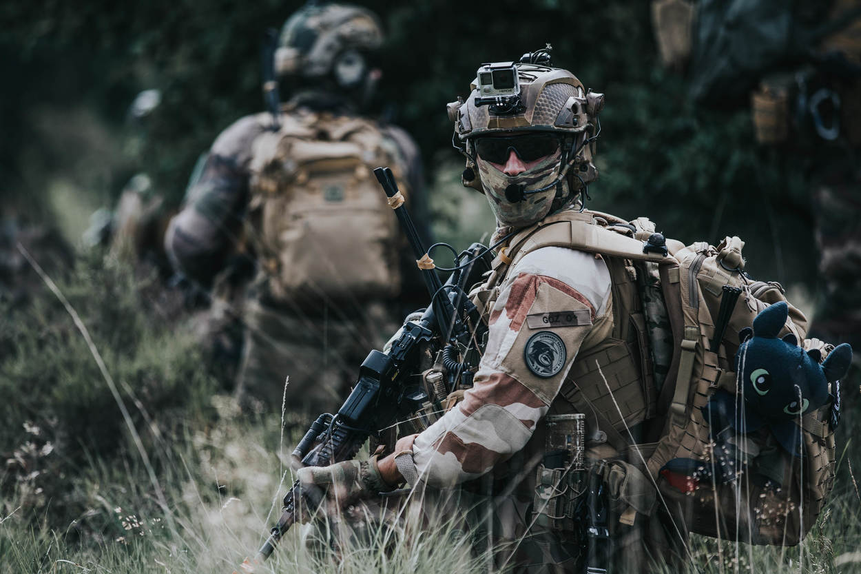 Deze Franse para - in actie tijdens een oefening in Nederland - bewijst dat niet alleen kinderen geen moment gescheiden kunnen worden van hun favoriete knuffel. Foto: sergeant Jan Dijkstra.