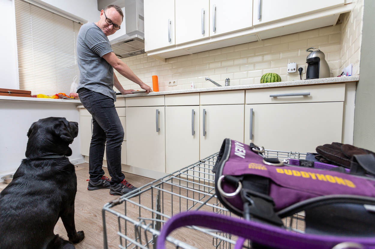 Door de stresstoornis leidt de vader van 2 tieners aan ernstige nachtmerries. Runo herkent de signalen en maakt hem op tijd wakker. Zo stoppen de herbelevingen en kan hij rustig slapen. “Maar ik kom ook weer onder de mensen. Runo creëert ruimte op drukke locaties en ze spiegelt gedrag. Als ik onrustig of zenuwachtig ben, wordt zij lastig. Daardoor ben ik me sneller bewust van mijn eigen houding.”
