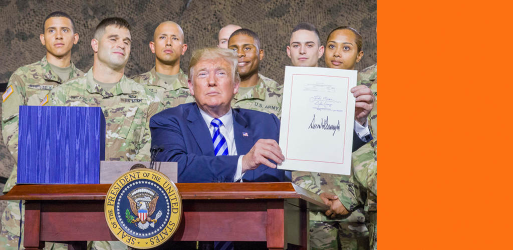 Trump ondertekende de National Defense Authorization Act, in aanwezigheid van duizenden soldaten in Fort Drum, een militaire basis ongeveer 400 kilometer ten noordwesten van New York City. Verouderde tanks, vliegtuigen en schepen zullen vervangen worden. De wet maakt onder andere budget vrij voor 77 F-35-gevechtsvliegtuigen, een nieuw vliegdekschip en andere oorlogsschepen en voor de modernisering van het Amerikaanse nucleaire arsenaal. (Foto: U.S. Army)