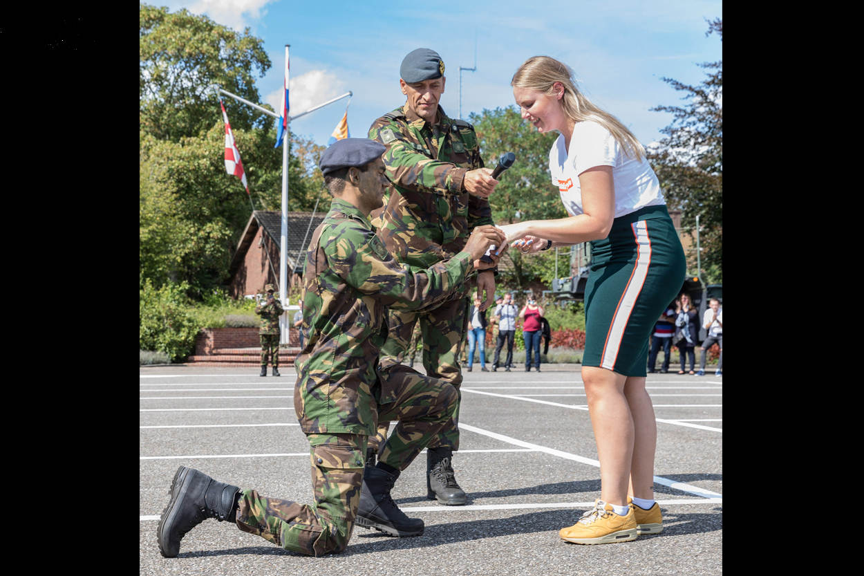 En na de eindoefening van de luchtmacht volgde voor de geslaagden de baretuitreiking, waarbij een dame in het publiek aangenaam verrast werd door haar aanstaande. Foto: Louis Meulstee.