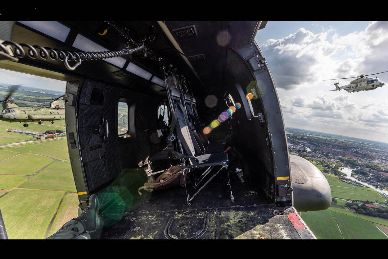 Voor de uitreiking van de Militaire Willems-Orde deed de Koninklijke Luchtmacht een flyby over het Haagse Binnenhof. Op de foto links een Chinook, middenin een Cougar en rechts een NH90. Foto: sergeant-majoor Eva Klijn.