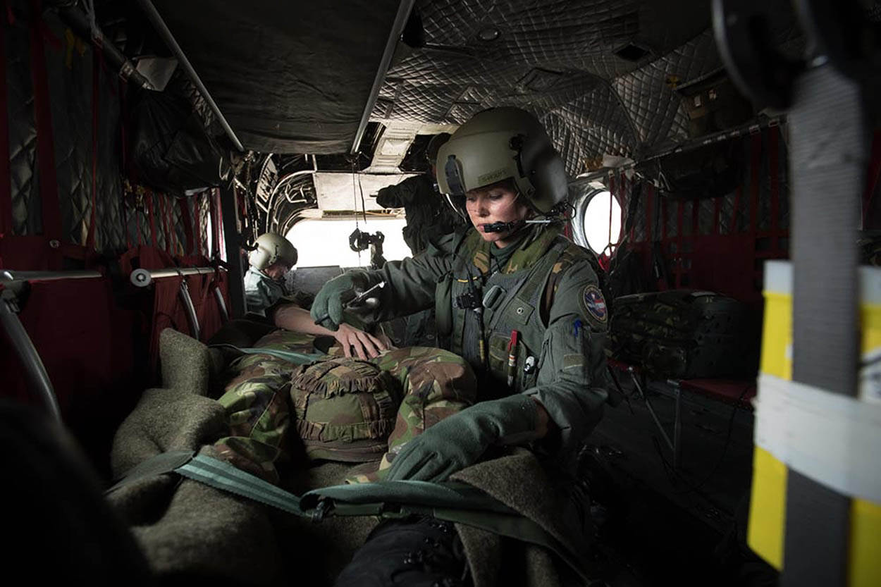 Algemeen Militair Arts luitenant ter zee 2OC (AR) Annique redt in de een Chinook het leven van oefenpatiënt Wessel. Rondom vliegbasis Gilze-Rijen traint personeel van de Operationele Gezondheidszorg medische evacuaties door de lucht tijdens de Operational Readiness Aeromedevac Course (ORAC). Foto: Sergeant Hille Hillinga.