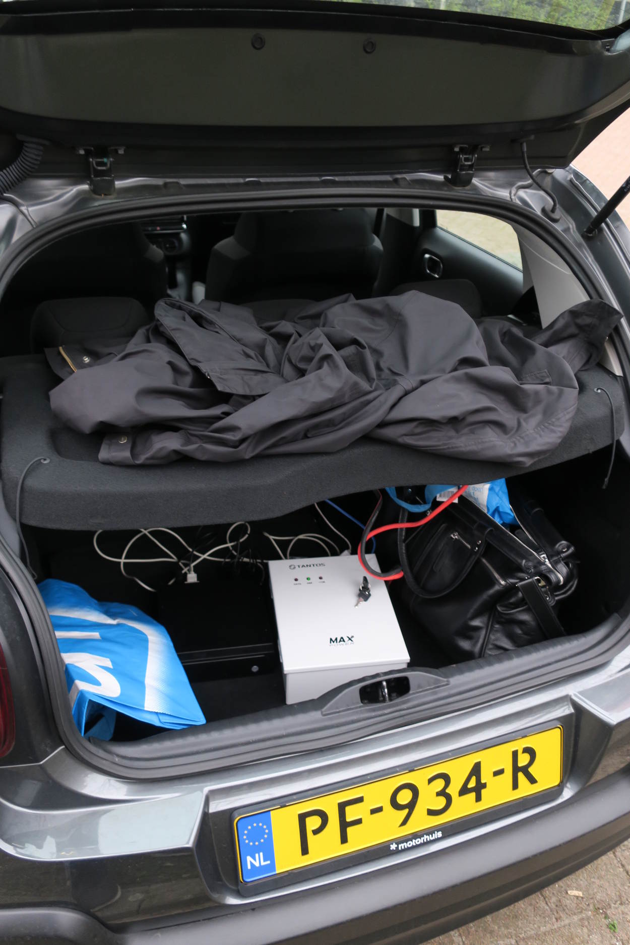 De benodigde accu mag niet mee in het vliegtuig, dus wordt in Nederland een nieuwe gekocht.