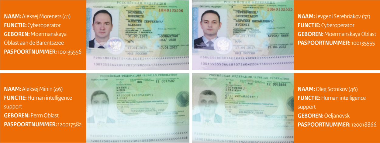 De 4 Russische inlichtingenofficieren reizen met diplomatieke paspoorten en werken voor de Russische militaire inlichtingendienst (GROe).