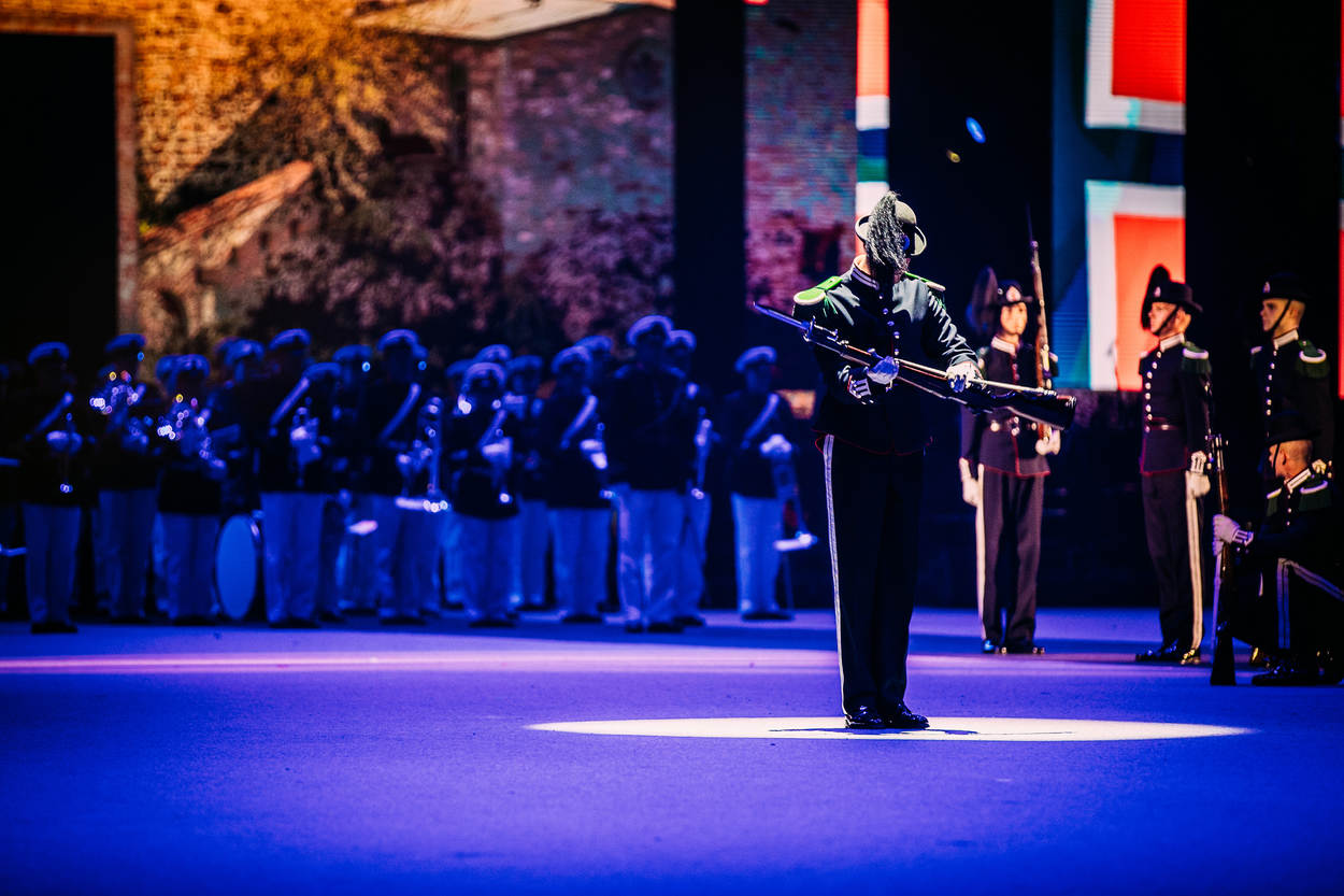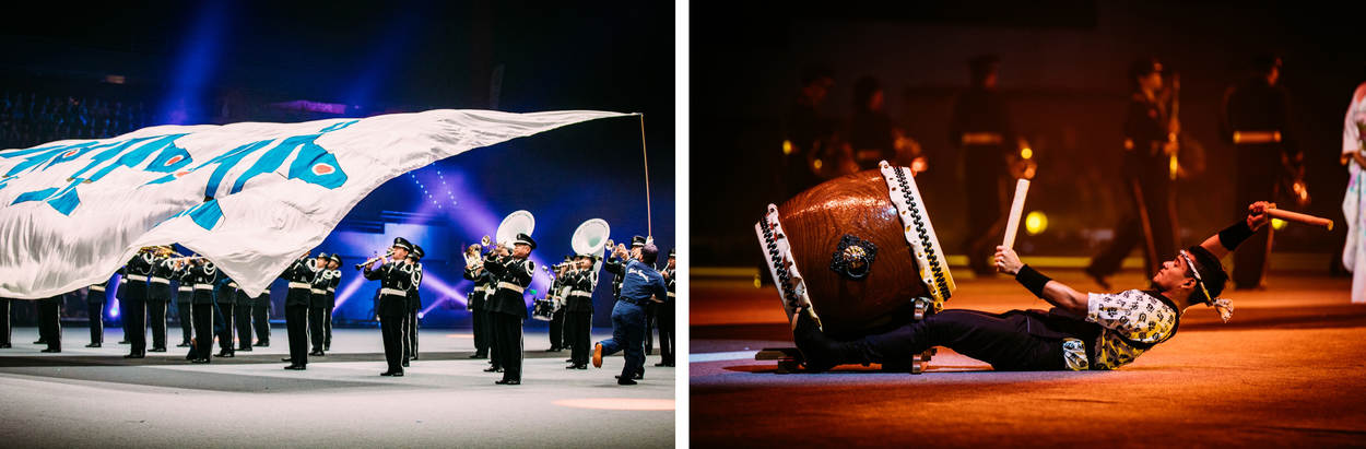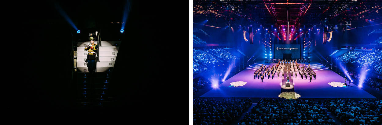 De aankondiging over de vernieuwde en gemoderniseerde taptoe was al veelbelovend, met de uitvoering stelde de organisatie de vele bezoekers niet teleur. Het nationale – militaire – muziekfestijn in Ahoy Rotterdam was het afgelopen weekend een smaakvolle mix van muziek, dans en show. En uiteraard ontbrak, in alle dimensies, ook het militaire aspect niet. Maar de taptoe is duidelijk meer dan alleen het militaire muziekfestival van weleer, al vormen de diverse orkesten van land- en luchtmacht, marechaussee en marine logischerwijs de hoofdmoot van de musici. Maar naast militaire muziek wisselen pop, klassiek en militair elkaar geregeld af. Eveneens met de nodige show, zoals bij het orkest van de Koninklijke Luchtmacht waarbij de ritmesectie per ‘Chinook’ afdaalde. De organisatie nodigt ieder jaar gasten van over de hele wereld uit. Het verst van huis was de Japanse luchtmacht Central Band. Voor het eerst in het 64-jarig bestaan van de taptoe, kwam er een muzikale delegatie uit dit land. Het demonstratieteam Blue Impulse was in Ahoy uiteraard niet met hun echte Kawasaki T-4 trainingsvliegtuigen aanwezig, maar daarvoor had de delegatie een passende oplossing bedacht. Van dichter bij huis was het muziek- en acrobatiekkorps van de Parijse brandweer. Bij hun optredens, onder ander op een medley van popmuziek, werd maar al te goed duidelijk hoezeer de nieuwe LED-achterwand van meerwaarde is. Dan weer stond ‘Ahoy’ aan de voet van de Eiffeltoren, het volgende moment op de stoep van de nachtclub Moulin Rouge. De acrobatiek die de 18 Parijse mannen en 1 vrouw lieten zien, was van een zeer hoog niveau. Al een aantal jaar is ook het Nederlands Politieorkest vaste gast. De musici verwezen duidelijk naar hun inzet vorig jaar op Sint-Maarten. Dergelijke koppelingen waren er ook bij de andere militaire orkesten, zoals bij de Koninklijke Militaire Kapel ‘Johan Willem Friso’ dat deze zomer in Litouwen optrad.