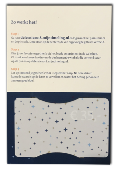 Het ministerie van Defensie besteedt dit jaar 2,4 miljoen euro aan het eindejaarsgeschenk voor medewerkers. Omdat circa 10% deze cadeaubon van gemiddeld € 35,- niet gebruikt, gaat het ongebruikte tegoed voor het eerst naar goede doelen.