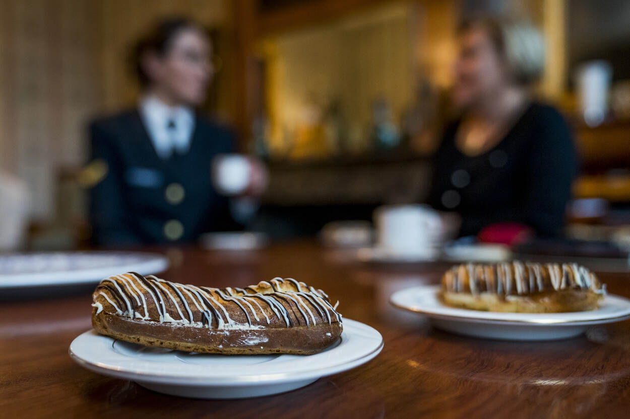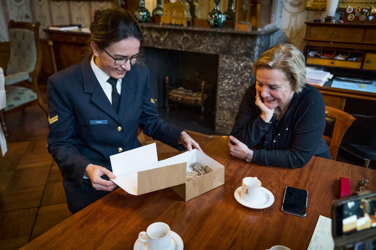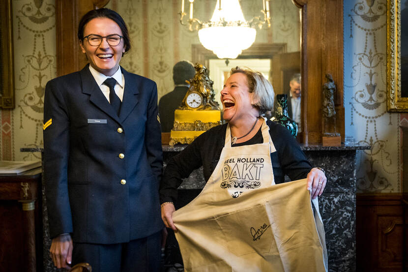"Eclairs met vers geroerde advocaat. Misschien is het een beetje vroeg voor advocaat, maar er zit ook slagroom en chocolade in", verduidelijkte korporaal Anna. Vroeg of niet, de minister genoot van de lekkernij. Zelf keek ze graag naar het bakprogramma en als de tijd het toelaat bakt ze ook graag zelf. "Dan komt dit cadeau goed van pas", reageert Anna terwijl ze een schort met haar handtekening overhandigt. "Ik vind dit wel heel leuk zeg."