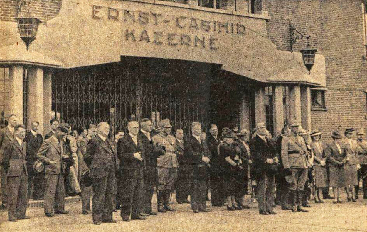 Hoogwaardigheidsbekleders en militairen bij de opening van de Ernst Casimirkazerne op 8 augustus 1939.