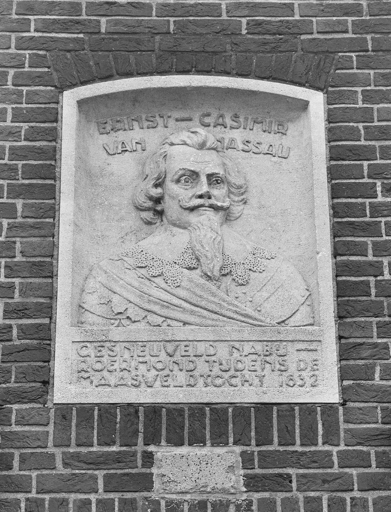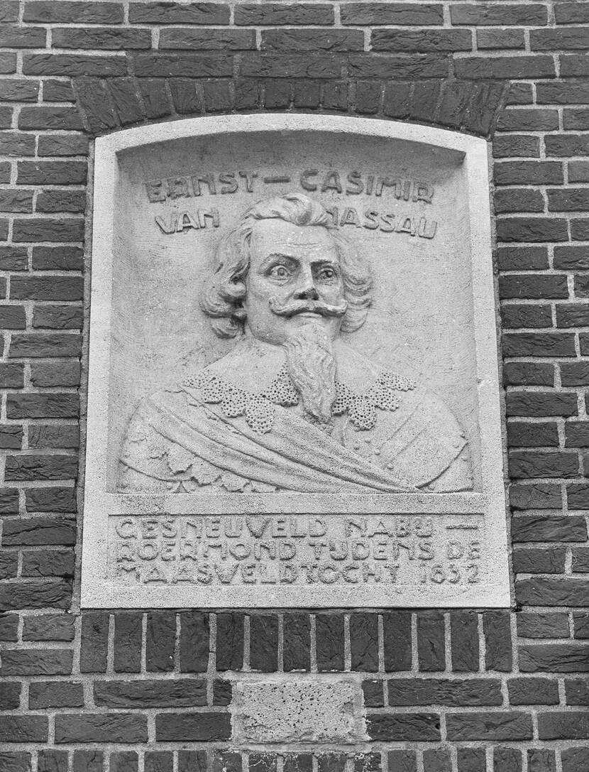 Herinneringssteen van Ernst Casimir in het monument voor het poortgebouw door beeldhouwer Victor Sprenkels. (Foto: L.M. Tangel, Collectie Rijksdienst voor het Cultureel Erfgoed, objectnummer 330.344)