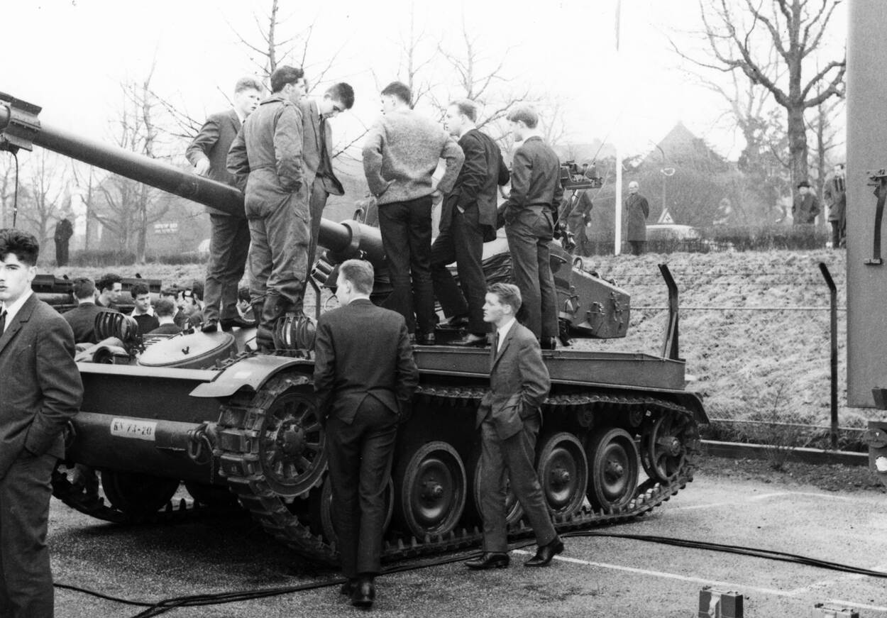 Jonge mannen op en om een AMX-13 lichte tank tijdens een open dag bij de Technische Dienst in 1966.