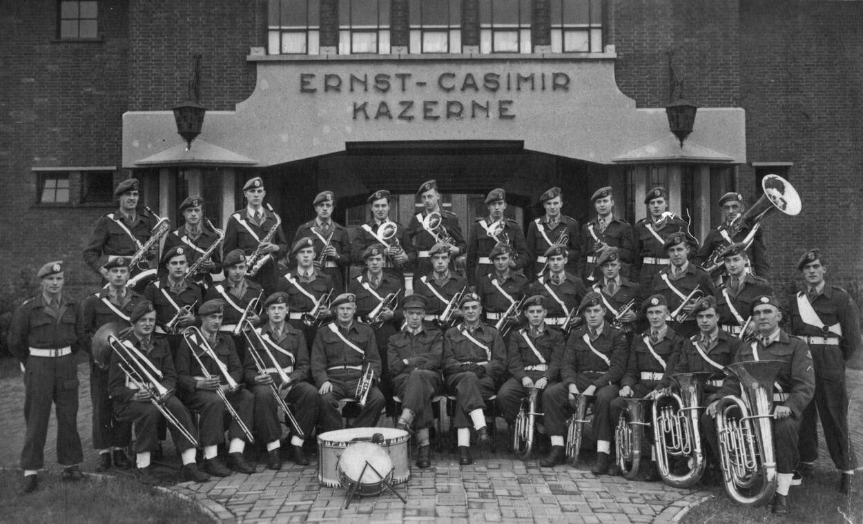 Het Tamboer- en Fanfarekorps der Limburgse Jagers eind jaren 50 voor de poort van de kazerne.