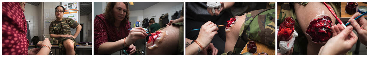 Met onder meer grimeermaterialen, nepbloed en spatels maken LOTUS-slachtoffers niet van echt te onderscheiden verwondingen. Van schot-, scherf- en brandwonden tot letsel door ontploffing, of amputaties; niets is te gek. “Iedere verwonding is weer een nieuwe uitdaging”, reageert LOTUS-coördinator Cora. “Net een wondenfabriek”, voegt Wietske daaraan toe. Zij werkt als LOTUS onder meer voor Defensie.