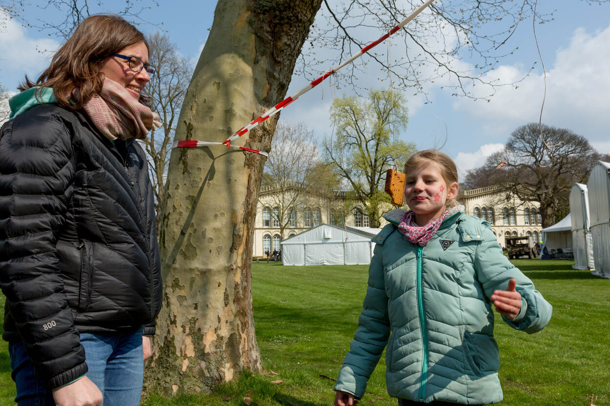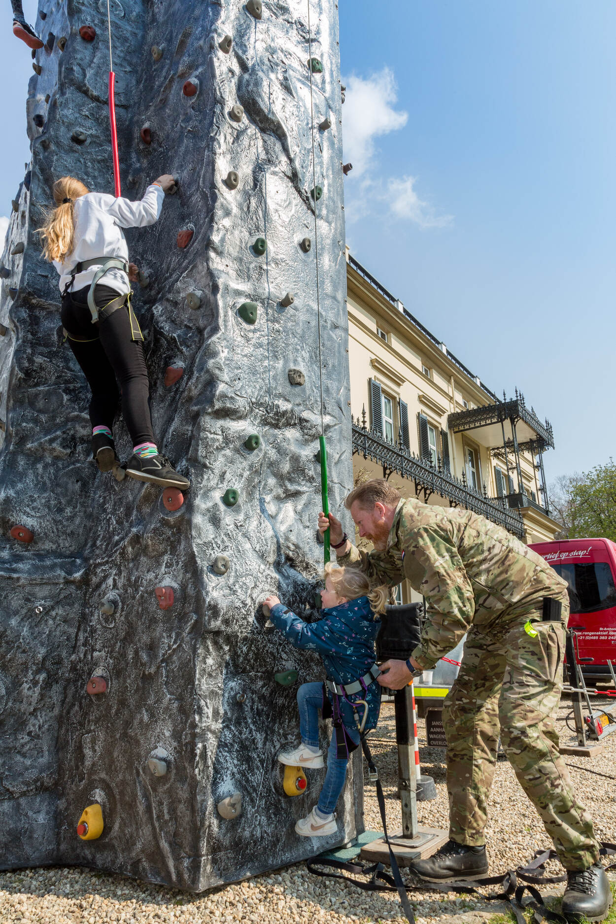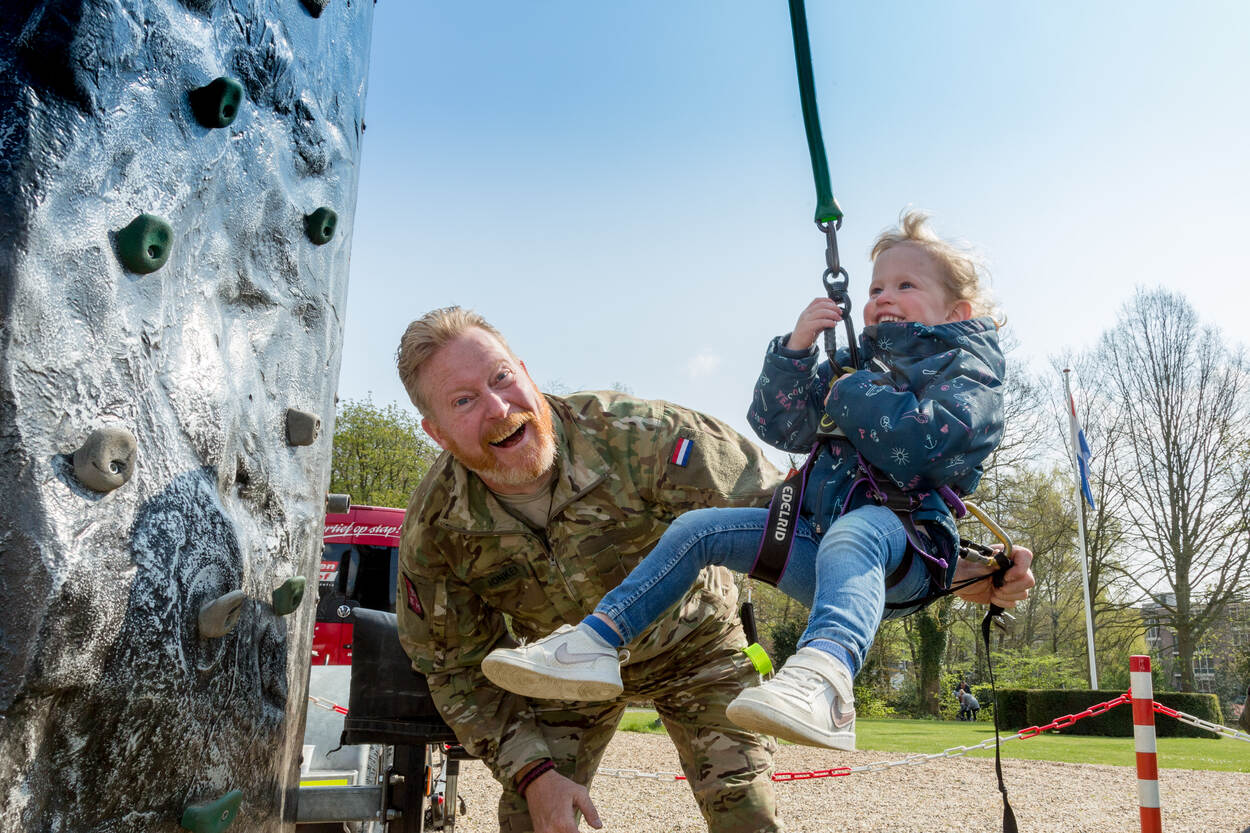 Bij de klimtoren hijst adjudant Pascal Jonker de 3-jarige Lieke in een harnas. Het is bijna vanzelfsprekend dat de werving van 11 Luchtmobiele Brigade, een bijna-buurman van Bronbeek, goed zichtbaar aanwezig is. Grote broer Lucas (5) slaat het geploeter van zijn zusje wat minachtend gade. “Ik kwam veel hoger”, mompelt hij.