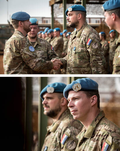 Majoors Ivo en Jorn krijgen een medaille uitgereikt voor de VN-vredesmissie Minusma. Information Operations maakte het werk voor de LRRPTG makkelijker door de Nederlandse herkenbaarheid te vergroten.