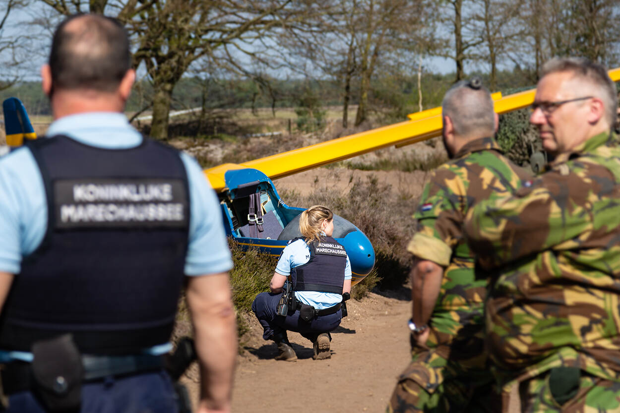 De Koninklijke Marechaussee en 20 Natresbataljon assisteerden op 20 april bij een ongeluk met een zweefvliegtuig op het oefenterrein Arnhemse Heide. Het toestel uit 1963 probeerde te landen op zweefvliegcentrum Terlet, maar moest plotseling uitwijken naar het militaire oefenterrein. Het toestel werd daarbij zwaar beschadigd. De piloot bleef ongedeerd. Foto: Martin Bos.