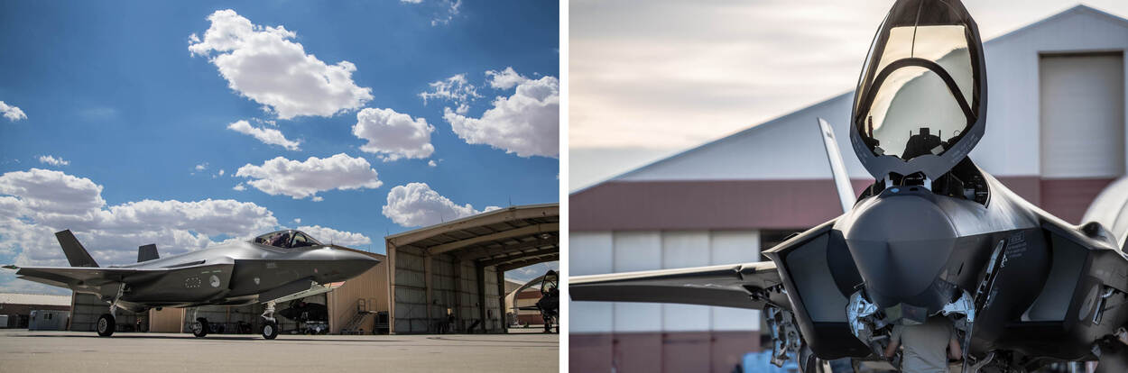 Links: Vertrek vanaf Edwards Air Force Base, tijdelijk thuis van de uitdijende F-35-vloot. | Rechts: Belangrijk onderdeel van het F-35 testprogramma is het uitvoeren van een rapid reaction missie. Aanvankelijk zou 323 Test en Evaluation Squadron hiervoor op Hawaii bombarderen. Mede vanwege de Luchtmachtdagen werd voor Nederland gekozen.